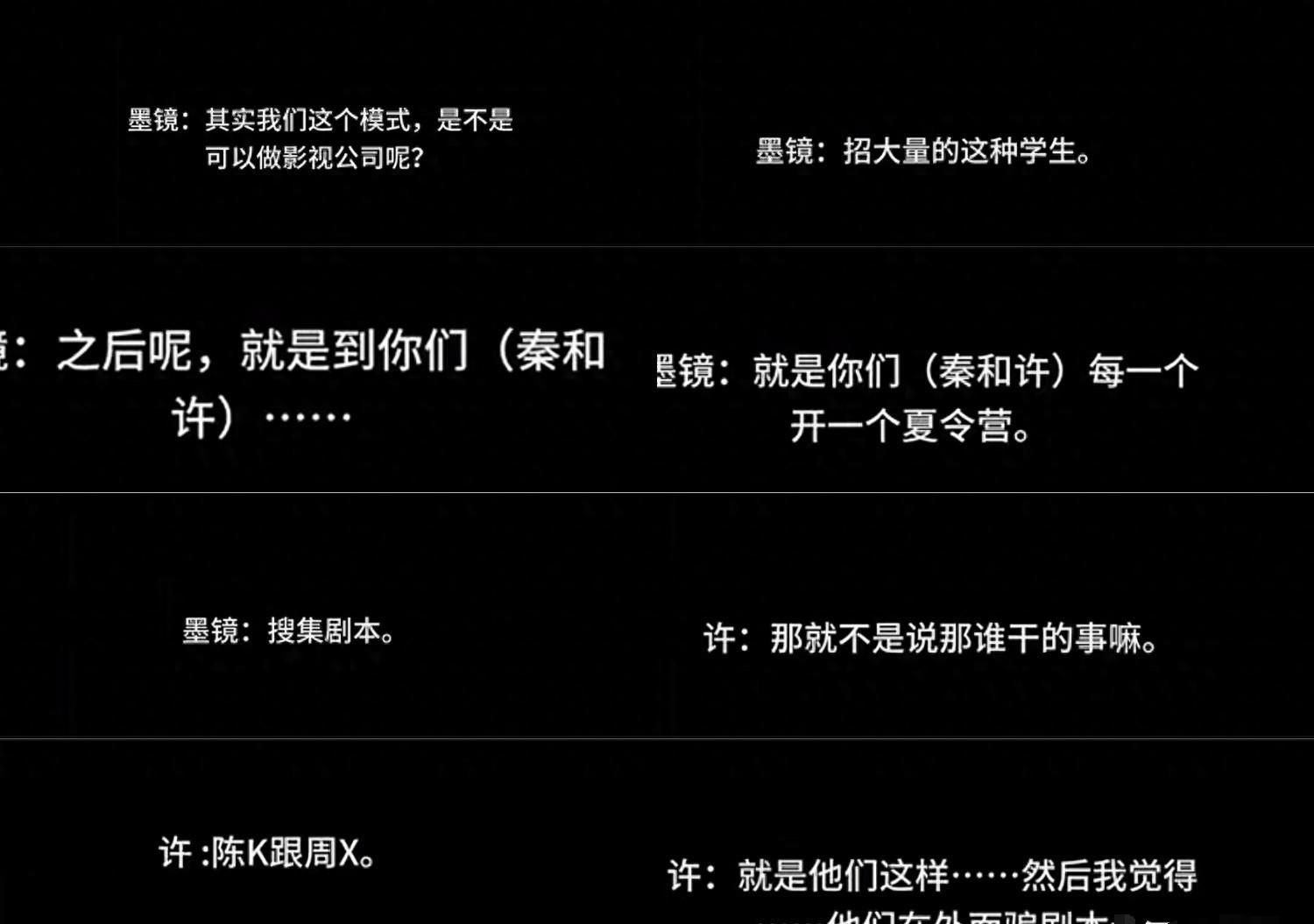 21. 录音中,王家卫与核心团队商议时表示,计划联合数家影视公司共同创办面向高校学生及青年创作者的培训项目,对外宣称目标为“挖掘潜力新锐,助力成长成才”,但实际上却是为了系统性收集学员的原创素材资源。